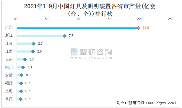 2021年1-9月中國燈具及照明裝置產量為39.5億套(臺、個) 華南地區產量最高(占比49.85%)