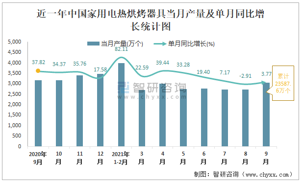 2021年1-9月中國家用電熱烘烤器具產量為23587.6萬個 同比增長27.57%