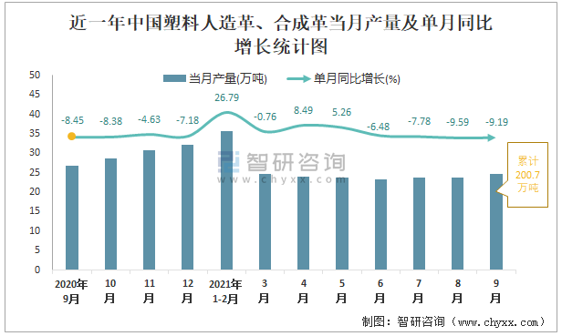 根據國家統計局數據顯示:2021年9月中國塑料人造革、合成革產量為24.7萬噸,同比下降9.19%;2021年1-9月中國塑料人造革、合成革累計產量為200.7萬噸,同比下降11.51%;2015-2020年中國塑料人造革、合成革產量2018年跌至最低,次年有所回升。