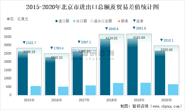 2015-2020年北京市進出口總額及貿易差值統計圖