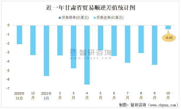 近一年甘肅省貿易順逆差值統計圖