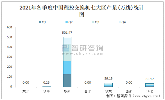 2021年各季度中國程控交換機(jī)七大區(qū)產(chǎn)量統(tǒng)計(jì)圖