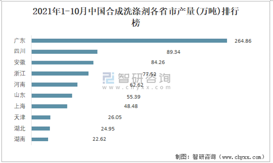 2021年1-10月中國合成洗滌劑各省市產(chǎn)量排行榜