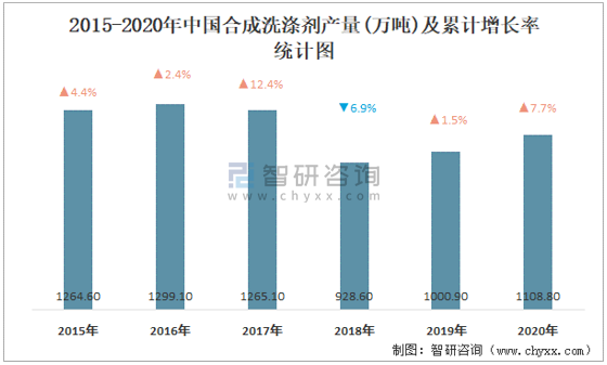 2015-2020年中國合成洗滌劑產(chǎn)量及累計增長率統(tǒng)計圖