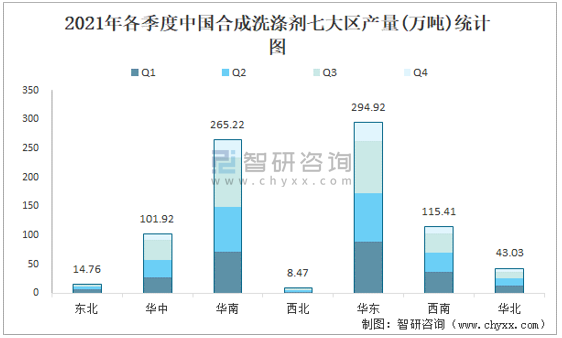 2021年各季度中國合成洗滌劑七大區(qū)產(chǎn)量統(tǒng)計圖