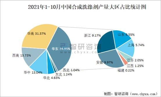 2021年1-10月中國合成洗滌劑產(chǎn)量大區(qū)占比統(tǒng)計圖