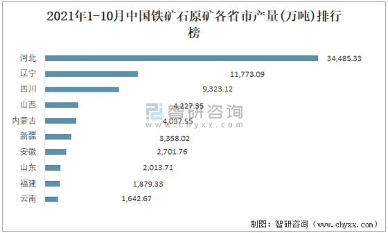 2021年1-10月中國(guó)鐵礦石原礦各省市產(chǎn)量排行榜