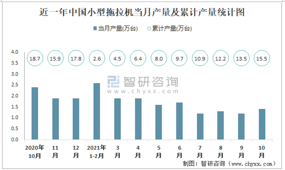 近一年中國小型拖拉機當月產量及累計產量統計圖