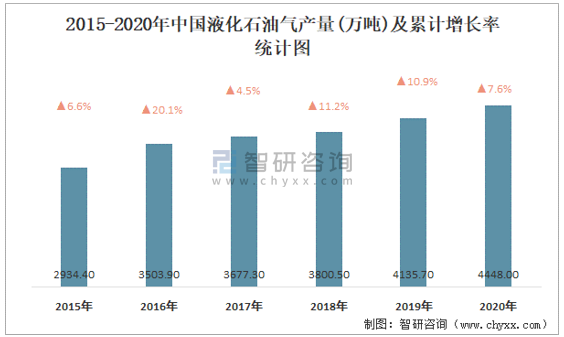 2015-2020年中國液化石油氣產量及累計增長率統計圖