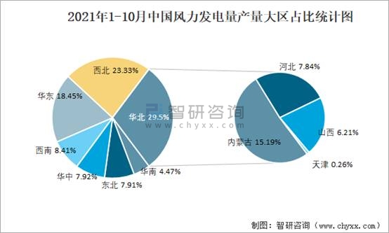 2021年1-10月中國風力發電量產量為4515億千瓦時 華北地區產量最高(占比29.5%)