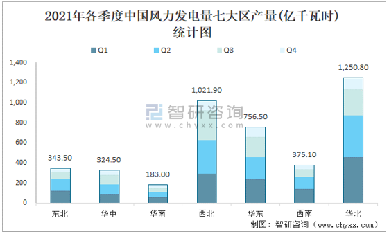 2021年各季度中國風力發電量七大區產量統計圖