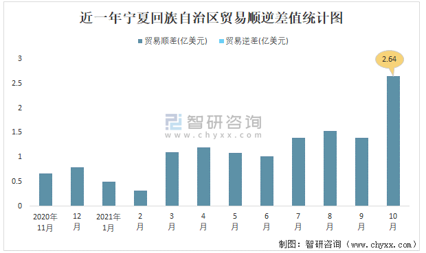 近一年寧夏回族自治區貿易順逆差值統計圖