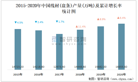 2015-2020年中國線材(盤條)產(chǎn)量及累計增長率統(tǒng)計圖