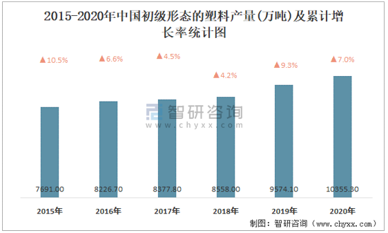 2015-2020年中國初級形態的塑料產量及累計增長率統計圖