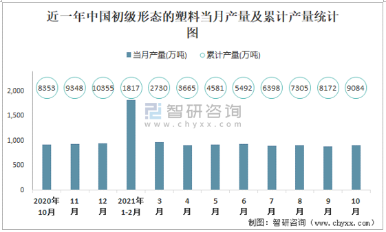 近一年中國初級形態的塑料當月產量及累計產量統計圖