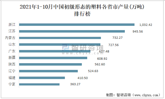 2021年1-10月中國初級形態的塑料各省市產量排行榜