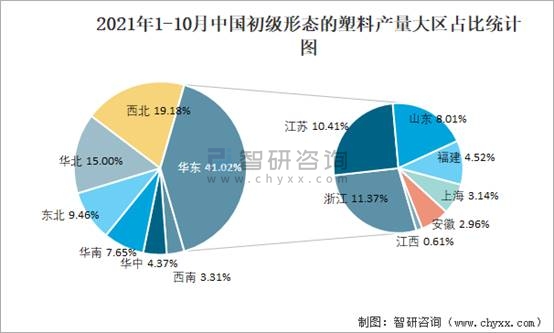 2021年1-10月中國初級形態的塑料產量大區占比統計圖