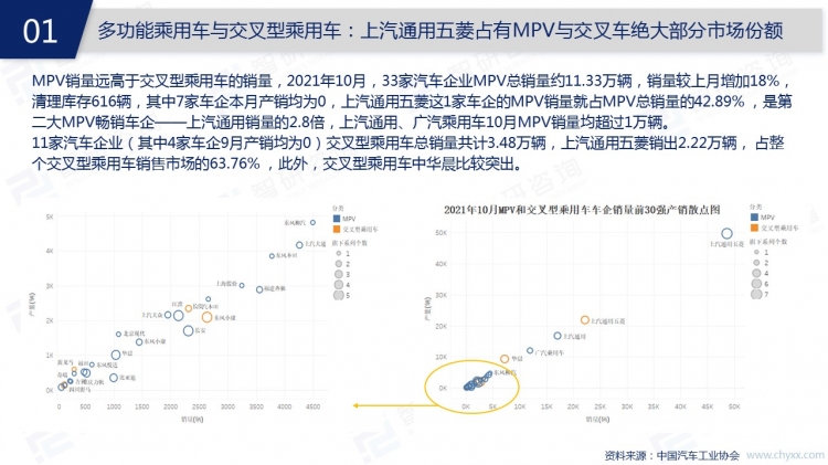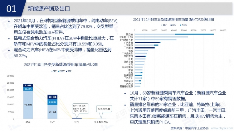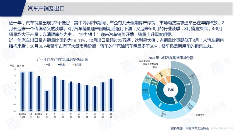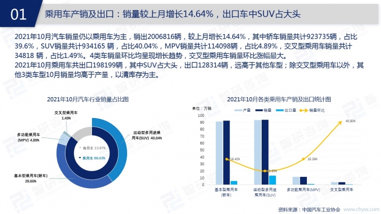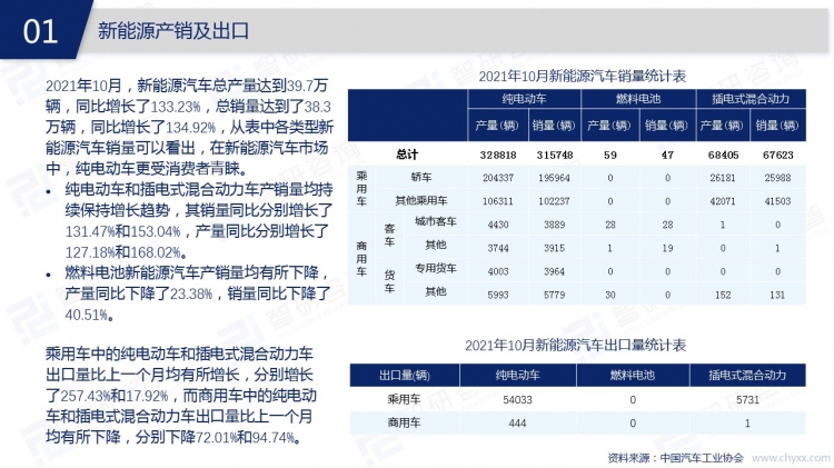 2021年10月,中國汽車市場迎來銷售旺季,汽車銷量環比增加了12.77%。中國的汽車市場仍以汽油類汽車為主,新能源類汽車市場份額不斷擴大,特別是乘用車市場,純電動、插電式混合動力的新能源汽車同比增幅均超過100%。隨著新能源技術的不斷創新,各地區充電樁建設的提速,未來新能源汽車取代燃油車只是時間問題。