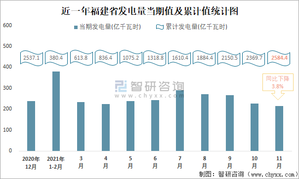近一年福建省發電量當期值及累計值統計圖