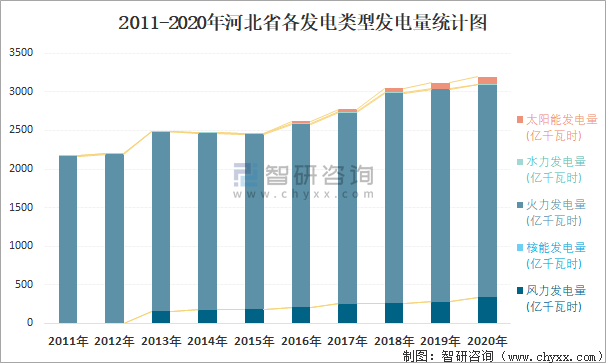 2011-2020年河北省各發(fā)電類型發(fā)電量統(tǒng)計圖