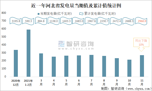 近一年河北省發(fā)電量當期值及累計值統(tǒng)計圖