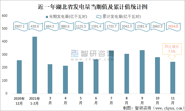 近一年湖北省發(fā)電量當(dāng)期值及累計值統(tǒng)計圖