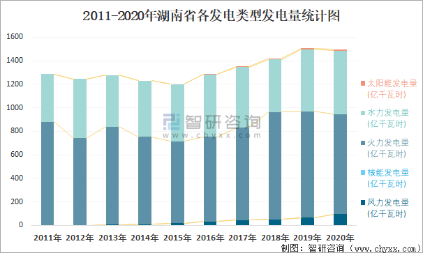 根據國家統計局數據統計可知:2011-2020年湖南省發電量有所波動,總體呈現下降趨勢,從發電量類型來看,火力發電量占比最大(2020年占比為56.89%),且近10年有所波動,總體呈現下降趨勢;2011-2020年湖南省電力消費量(實物量)逐年遞增,2017年-2018年之間增幅最大,為10.35%,2020年湖南省電力消費量(實物量)達到1929.28億千瓦時。