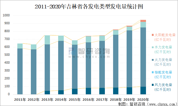 2011-2020年吉林省各發(fā)電類型發(fā)電量統(tǒng)計圖