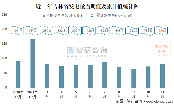 近一年吉林省發(fā)電量當期值及累計值統(tǒng)計圖