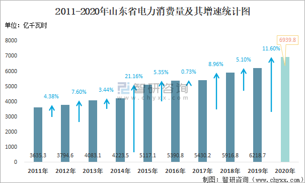 2011-2020年山東省電力消費量及其增速統計圖