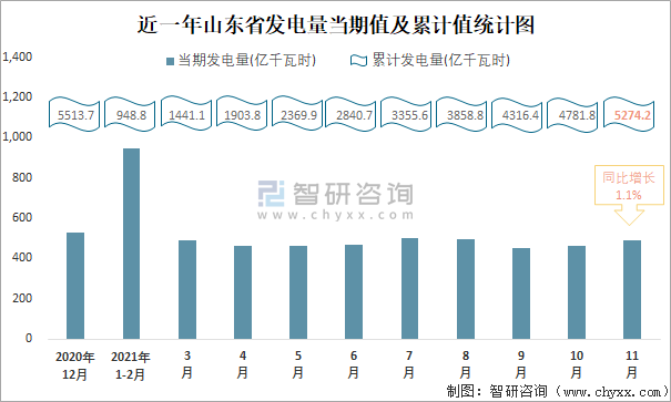 近一年山東省發電量當期值及累計值統計圖