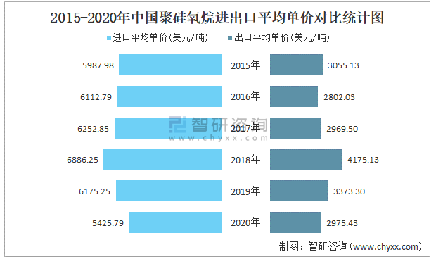 2015-2020年中國聚硅氧烷進出口平均單價對比統計圖