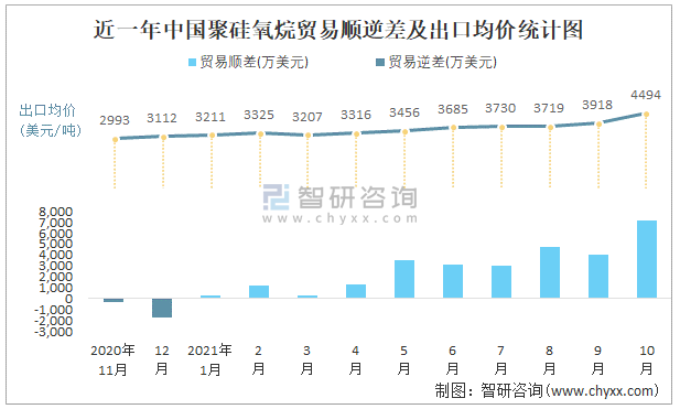 近一年中國聚硅氧烷順逆差及出口均價統計圖