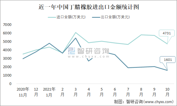 根據中國石油和化學工業聯合會數據顯示:2021年10月中國丁腈橡膠進口數量為2.2萬噸,出口數量為1萬噸;進口金額為4731萬美元,出口金額為1601萬美元;近一年中國丁腈橡膠出口總金額小于進口總金額,貿易逆差為主,進口均價2151美元/噸。