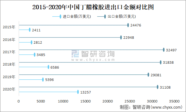 2015-2020年中國丁腈橡膠進出口金額對比統計圖