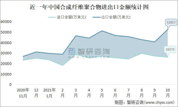 根據中國石油和化學工業聯合會數據顯示:2021年10月中國合成纖維聚合物進口數量為9.5萬噸,出口數量為40萬噸;進口金額為26079萬美元,出口金額為52857萬美元;近一年中國合成纖維聚合物出口總金額大于進口總金額,貿易順差為主,出口均價1321美元/噸。