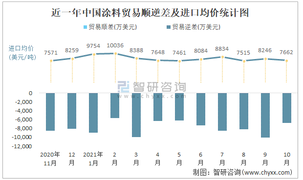 根據(jù)中國石油和化學(xué)工業(yè)聯(lián)合會(huì)數(shù)據(jù)顯示:2021年10月中國涂料進(jìn)口數(shù)量為1.7萬噸,出口數(shù)量為1.8萬噸;進(jìn)口金額為13025萬美元,出口金額為6269萬美元;近一年中國涂料出口總金額小于進(jìn)口總金額,貿(mào)易逆差為主,進(jìn)口均價(jià)7662美元/噸。