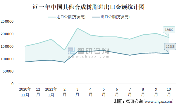 根據中國石油和化學工業聯合會數據顯示:2021年10月中國其他合成樹脂進口數量為74.4萬噸,出口數量為46.4萬噸;進口金額為186026萬美元,出口金額為122350萬美元;近一年中國其他合成樹脂出口總金額小于進口總金額,貿易逆差為主,進口均價2500美元/噸。