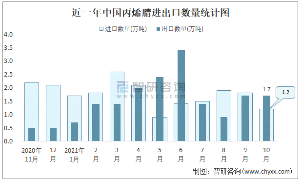 根據中國石油和化學工業聯合會數據顯示:2021年10月中國丙烯腈進口數量為1.2萬噸,出口數量為1.7萬噸;進口金額為2512萬美元,出口金額為3556萬美元;近一年中國丙烯腈出口總金額小于進口總金額,貿易逆差為主,進口均價2093美元/噸。