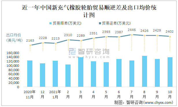 近一年中國(guó)新充氣橡膠輪胎順逆差及出口均價(jià)統(tǒng)計(jì)圖