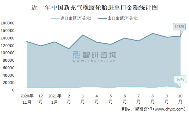近一年中國(guó)新充氣橡膠輪胎進(jìn)出口金額統(tǒng)計(jì)圖