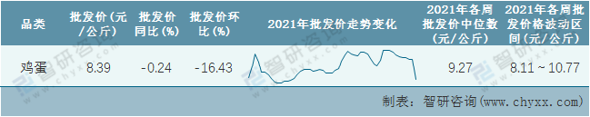 2021年第53周(12月20日-12月26日)全國雞蛋平均批發價分析:本周批發價為8.39元/公斤,同比下跌0.24%