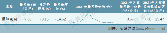 根據農村農業部數據統計可知:2021年第53周全國巨峰葡萄平均批發價為7.36元/公斤,同比下跌3.16%,環比下跌14.62%(第52周數據未公布,按第51周的數據統計),2021年巨峰葡萄價格總體呈現下降趨勢,價格最高峰出現在上半年,2021年全國巨峰葡萄平均批發價最高達到15.47元/公斤,批發價最低也要8.67元/公斤。