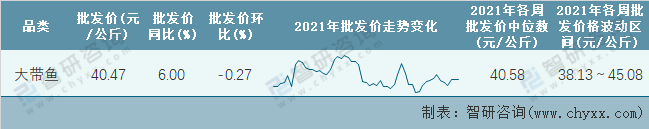 根據農村農業部數據統計可知:2021年第53周全國大帶魚平均批發價為40.47元/公斤,同比增加6%,環比下跌0.27%(第52周數據未公布,按第51周的數據統計),2021年大帶魚價格總體出現了多個峰值,價格最高峰出現在年中,2021年全國大帶魚平均批發價最高達到45.08元/公斤,批發價最低也要38.13元/公斤。