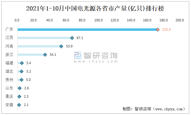2021年1-10月中國電光源產量為356.5億只 華南地區產量最高(占比48.32%)
