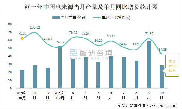 根據國家統計局數據顯示:2021年10月中國電光源產量為28.6億只,同比下降14.86%;2021年1-10月中國電光源累計產量為356.5億只,同比增長46.99%;2015-2020年中國電光源產量2019年跌至最低值,次年大幅度回升。