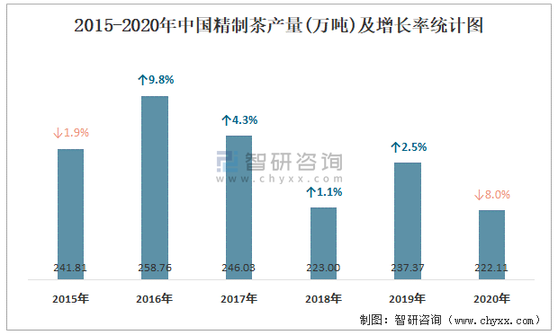 2015-2020年中國(guó)精制茶產(chǎn)量及增長(zhǎng)率統(tǒng)計(jì)圖