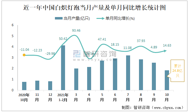 2021年1-10月中國白熾燈泡產量為24.8億只 同比增長20.95%