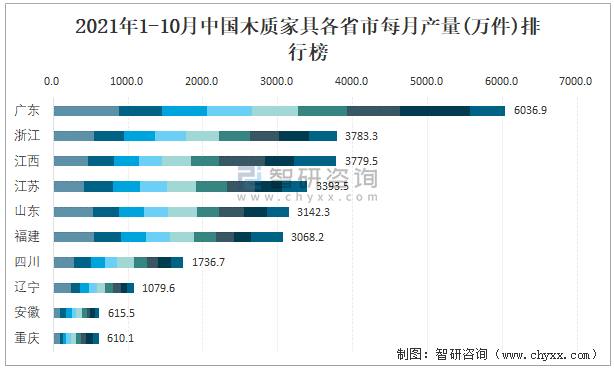2021年1-10月中國木質(zhì)家具各省市每月產(chǎn)量排行榜