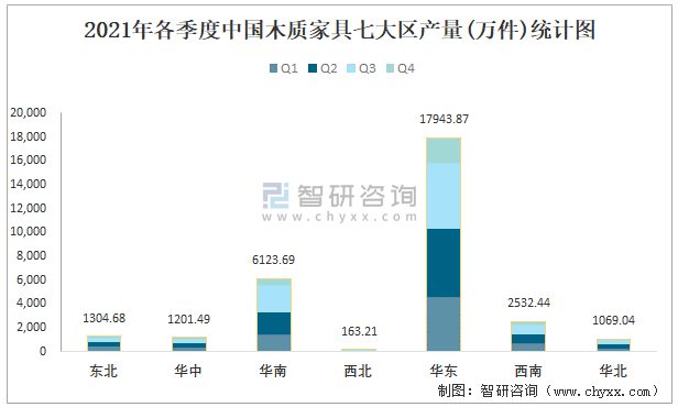 2021年各季度中國木質(zhì)家具七大區(qū)產(chǎn)量統(tǒng)計(jì)圖